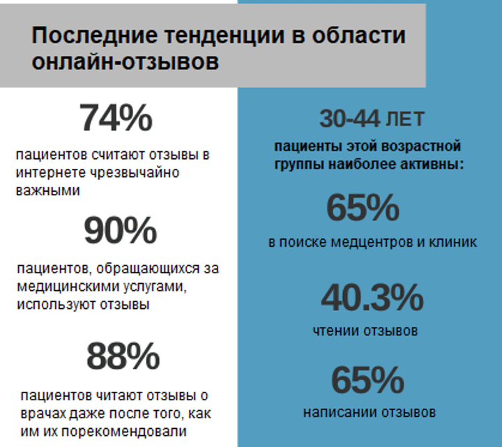 Исследования показывают, что 74% пациентов считают отзывы в интернете чрезвычайно важными. Пациенты в возрасте 30-44 лет являются наиболее активной возрастной группой в поиске медцентров и клиник (85,8%), чтении отзывов (65%) и их написании (40,3%). При выборе медицинского учреждения 65% пациентов младше этого возраста утверждают, что отзывы в интернете помогают им составить мнение о клинике.