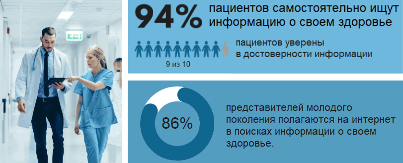 Недавнее исследование в области медицины показало, что почти все пациенты (94%) самостоятельно ищут информацию, касающуюся конкретных заболеваний или симптомов.