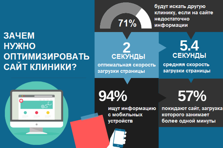 Около 60% пациентов переходят на сайт, содержащий актуальную медицинскую информацию. Почти три четверти посетителей (71%) теряют доверие к клинике, если на её сайте предоставляется неполная или неактуальная информации.