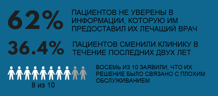 Более трети (36,4%) пациентов сменили клинику или лечащего врача в течение последних двух лет. Восемь из 10 заявили, что их решение было связано с плохим обслуживанием.