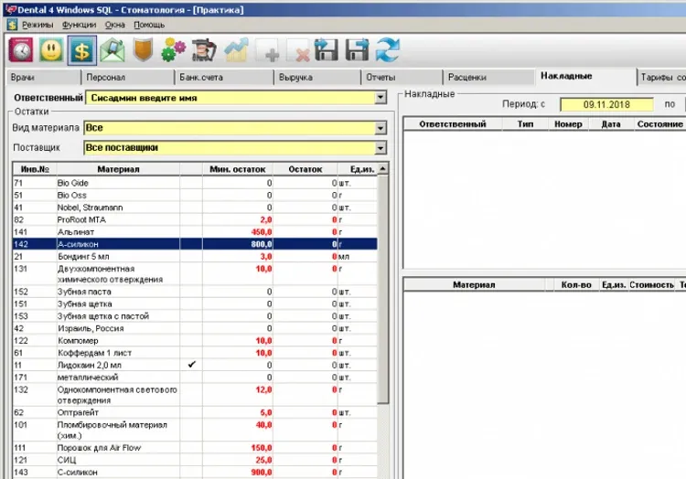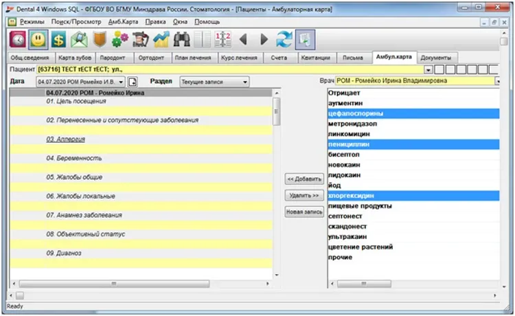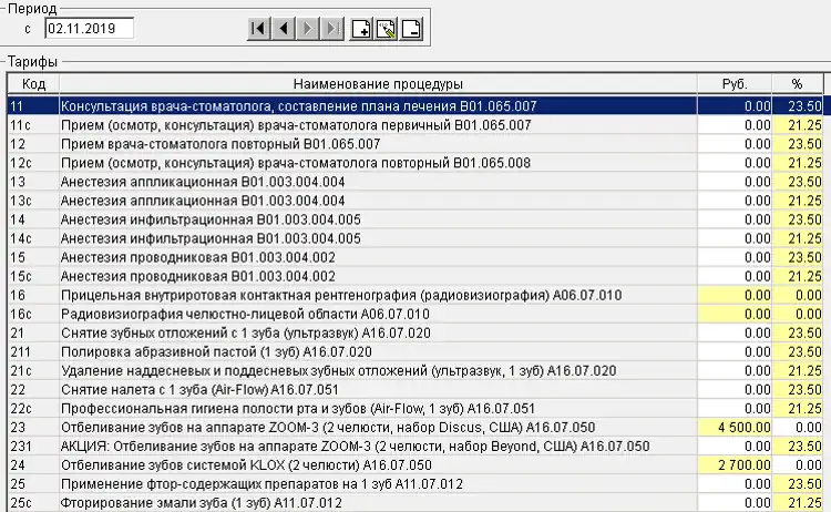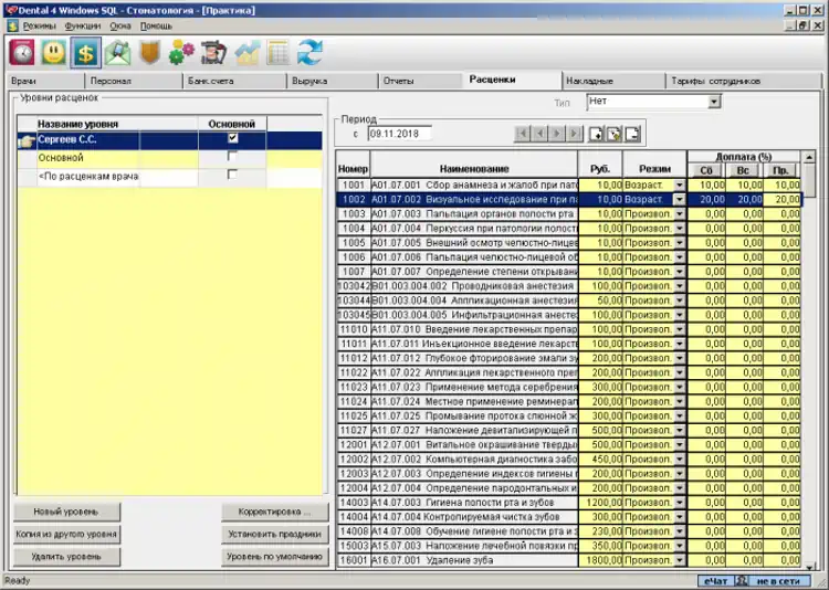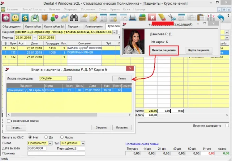 Курс лечения является основным рабочим окном для врача и содержит всю информацию о проведенном лечении, включая дополнительные затраты, стоимость процедур, лечащих врачей и ассистентов, а также заказ-наряды для выполнения зуботехнических работ.