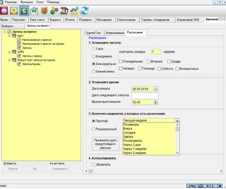 - отправки сообщения с привязкой к записи пациента в расписание