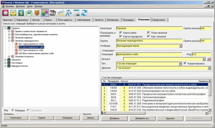 - Быстрый ввод выполненных процедур – через операции (комплексы услуг) или из плана лечения
