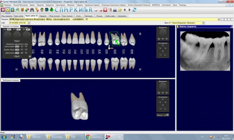 Графический редактор обеспечивает возможность просмотра рентгеновских снимков непосредственно в разделе «Карта зубов».
