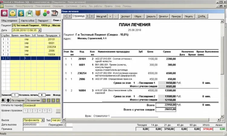 Функция планирования лечения является одним из ключевых факторов успеха стоматологической клиники. Вместо размытых устных рекомендаций пациент получает на руки распечатку плана лечения, включающего стоимость и сроки лечения. Это позволяет пациенту обсудить планируемое лечение в спокойной обстановке в кругу семьи и принять осознанное решение о начале лечения в конкретной клинике.
