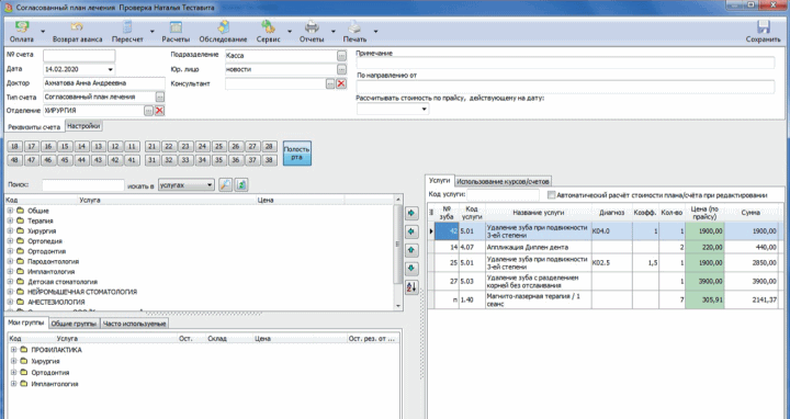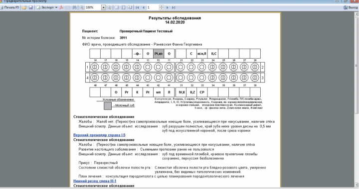 - Оформление документации для пациента, Печать договоров, информированного согласия, титульного листа медицинской карты стоматологического больного, результатов обследования и дневников приёмов по форме 043Лу.