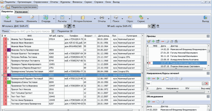 - Ведение лицевого счета пациента. История приёмов, платежей, направлений.