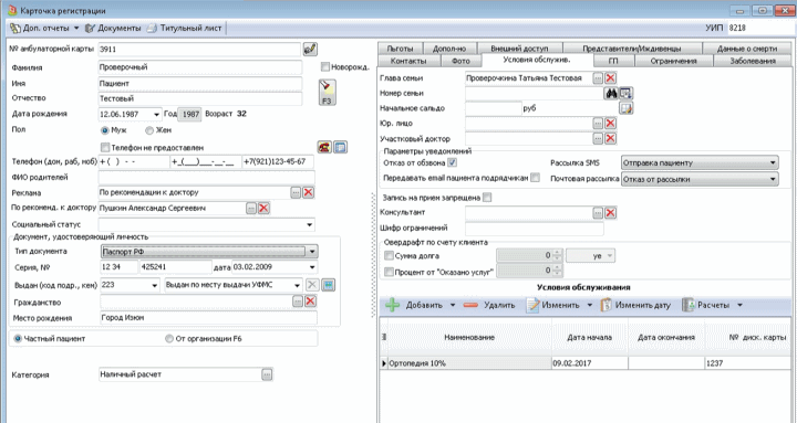 - Картотека пациентов. Карточка регистрации содержит все необходимые данные и фото пациента. Гибкая система поиска. Контроль заполнения обязательных полей.