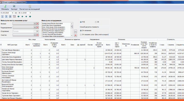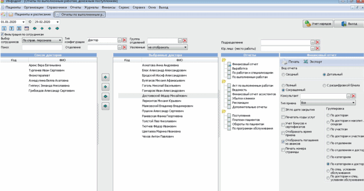 - Финансовая отчётность в разрезе врачей, отделений, подразделений, категорий пациентов.