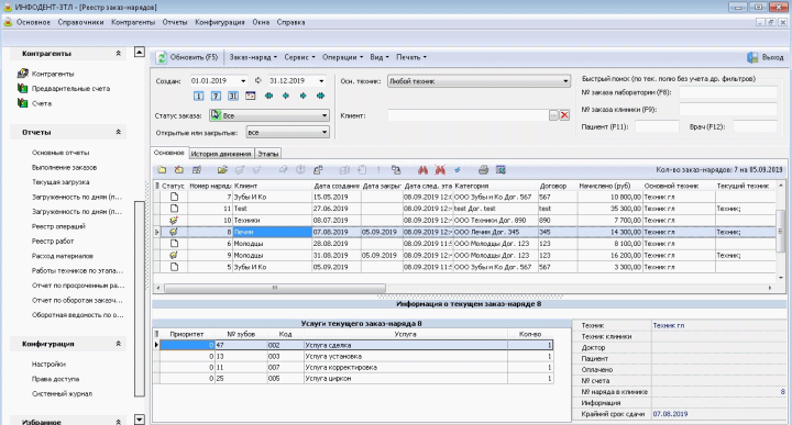 - Учёт зуботехнических заказ-нарядов: создание, распределение по подрядчикам и исполнителям, контроль сроков выполнения работ.