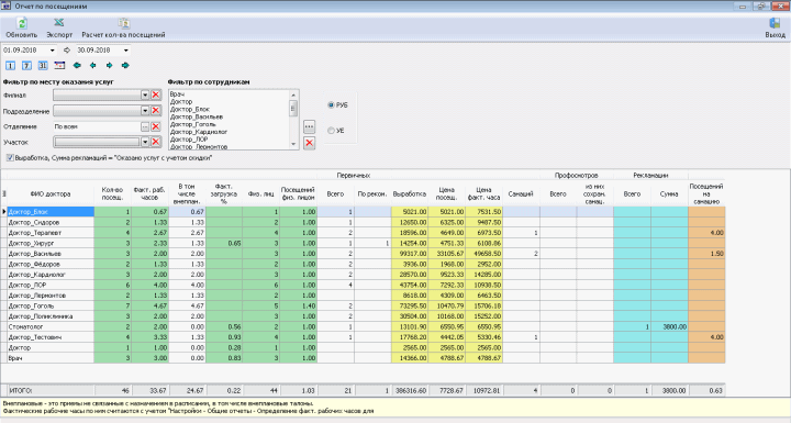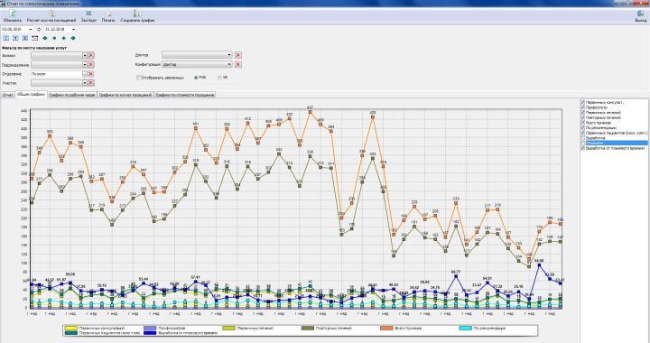 - Отчётность по движению клиентуры и работе регистратуры (первичные, повторные, неявки, переносы ит.п.).