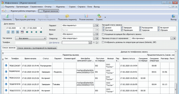 Модуль представляет собой клиента для интеграции МИС «ИНФОКЛИНИКА» /МИС «ИНФОДЕНТ» с различными серверами IP-телефонии (Asterisk, Infinity и др) или облачными АТС (Mango, Beeline, МГТС и др). Интеграционное решение позволяет клинике снизить число «потерянных» звонков и существенно сократить время получения необходимой информации, как в ходе разговора оператора с пациентом, так и при разборе конфликтных ситуаций.