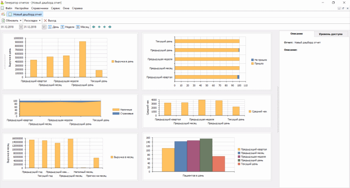 Аналитический модуль представляет собой набор готовых отчетов, в которых отображаются ключевые показатели работы медицинского и административного персонала: фактическая загрузка врача, фактическая стоимость часа работы, распределение первичных/повторных пациентов и т.п.