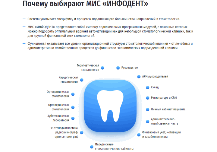 Продукт охватывает все уровни организационной структуры стоматологической клиники – от лечебных и административно-хозяйственных процессов до финансово-экономических подразделений клиники. При использовании медицинской информационной системы «ИНФОДЕНТ» позволяет: