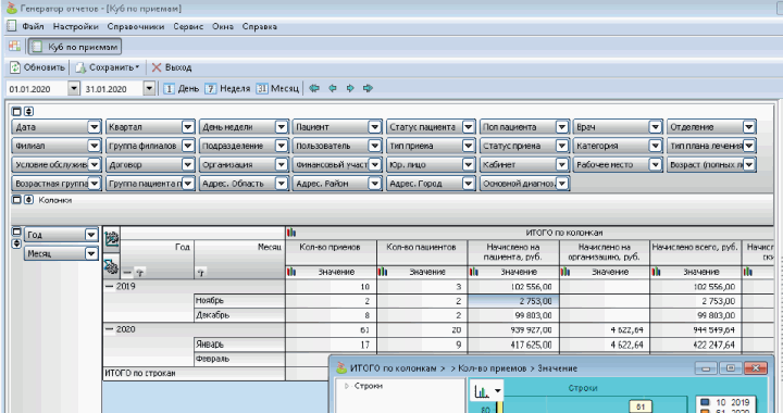 Модуль «OLAP- отчеты» позволяет оперативно получить данные по работе клиники по различным показателям.