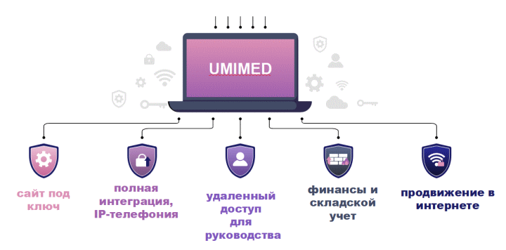 UMI MED - надежная медицинская информационная система для автоматизации частных клиник и стоматологий, которая работает на любом устройстве онлайн и в любом месте, где бы вы не находились, улучшает работу сотрудников и повышает эффективность персонала. Система имеет свою платформу, на которой клиника может создать сайт с индивидуальным дизайном и увеличить лояльность своих посетителей.