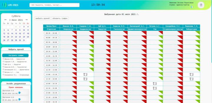 В UMI MED администратор клиники в едином окне видит график приема всех врачей на любую удобную дату и время, а также может выбирать нужные направления или врачей для поиска времени записи.