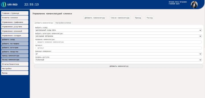 МИС UMI MED позволяет вести складской учет медикаментов и расходных материалов прямо из системы, на стороне ответственного сотрудника происходит пополнение склада клиники, а также списание позиций в случае выдачи медикаментов или расходных материалов на руки сотрудникам.