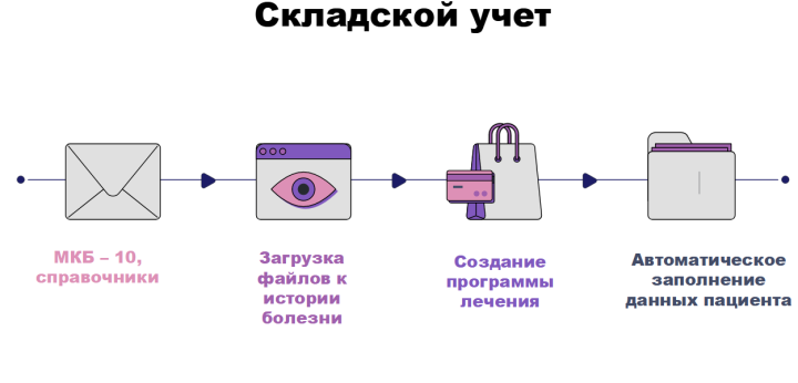 Модуль складского учета содержит в себе множество необходимых справочников и коды МКБ-10, позволяет загружать файлы к истории болезни пациента и создание программы лечения, выполняет автоматическое заполнение данных пациента и автоматически подгружает шаблоны из истории болезни.