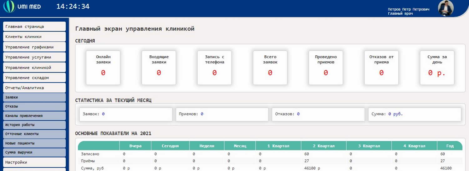 Медицинская информационная система UMI MED позволяет выгружать самые необходимые отчеты для руководителя клиники. В случае отсутствия необходимого отчета компания UMI MED создаст его бесплатно для своих клиентов.