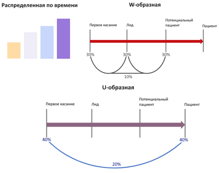 U-образная: первое и последнее касание и маркетинговая тактики имеют наибольшую ценность, а средние получают меньшую.