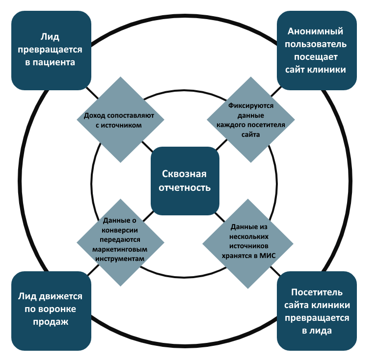 Как четко показано на этой схеме, сквозная отчетность включает в себя несколько основных видов деятельности, а именно: отслеживание посетителей сайта клиники; распределение доходов; интеграция и хранение данных; и распространение данных на различные инструменты продаж и маркетинга.